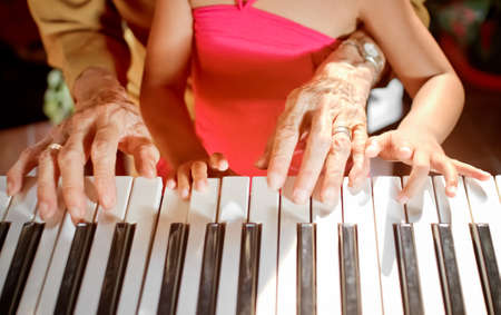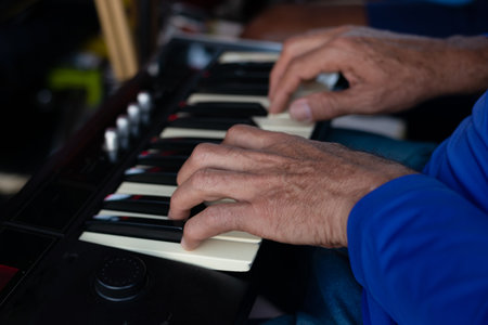 Selective focus on hands in the foreground of the pianst - rear flash to show slight movement