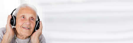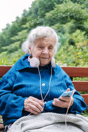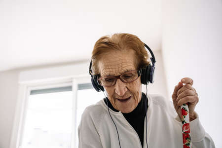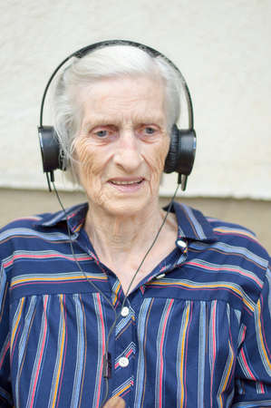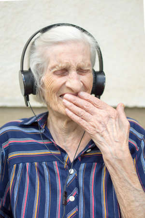 Ninety years old grandma reaction while listening to modern music. Grandma listening to music on headphones
