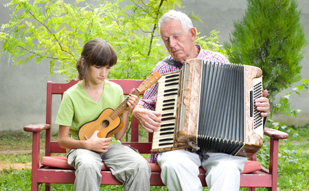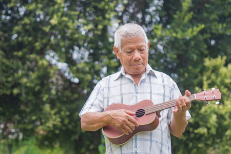 A happy senior man with short gray hair playing the ukulele, holding and looking at the ukulele while standing in a garden. Enjoy life after retiring. Concept of aged people and relaxation.
