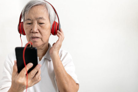 Asian senior woman in headphones listening to music online on mobile phone,old elderly hold smartphone wearing red headphones,watching video relaxing,stay at home,quarantine during COVID-19 outbreak