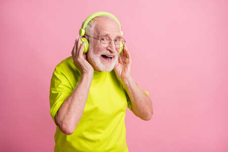 Photo of crazy old man listen music dance look empty space wear headphones spectacles lime clothes isolated on pink background