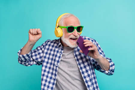 Portrait of excited crazy grandpa hold telephone singing enjoy new single isolated on teal color background