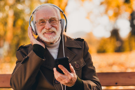 Elderly man enjoying music on headphones in an autumn park surrounded by vibrant foliage, embracing leisure and happiness