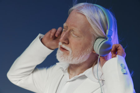 elderly man enjoying music, headphones on, closed eyes, emotional expression, white suit, studio background, calm atmosphere, feel of relaxation, cool color tones