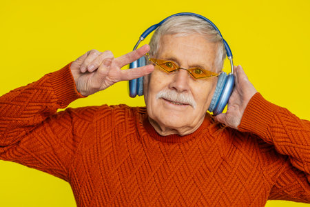 Excited senior stylish man listening music via headphones, dancing disco party fooling around having fun expressive gesticulating hands. Happy elderly old grandfather pensioner on yellow background