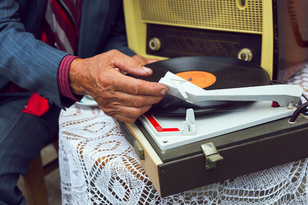 Lviv, Ukraine - Mar 08, 2019: Lviv street scene. Elderly man at a flea market paints a vinyl disc