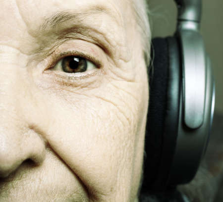 This song has never sounded better. Shot of an elderly male wearing headphones and listening to music in a studio against a grey background.