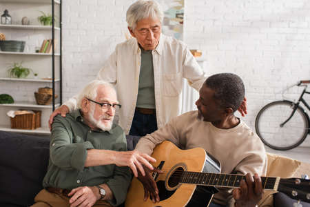 Happy senior interracial friends playing acoustic guitar and looking at camera at home