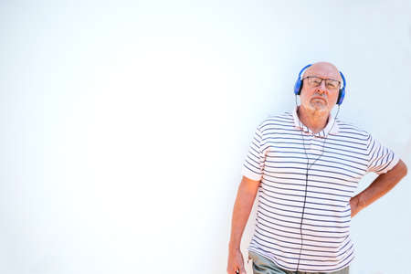 Relaxed bald senior man leaning on the wall while listening to music with blue headphones on a white background