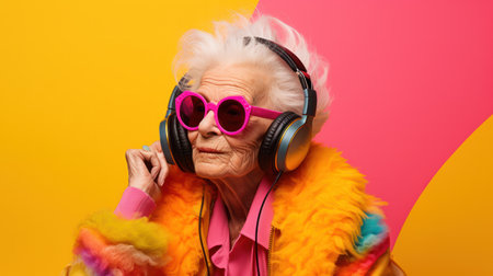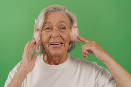 An Elderly Woman Delightfully Enjoying Her Favorite Music While Wearing Headphones