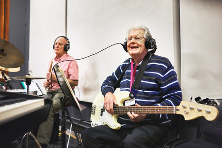 Recording studio, senior men and guitarist to sing, producer and song with audio, booth and singer. Microphone, headphones and musician for album performance, band or singing for entertainment label