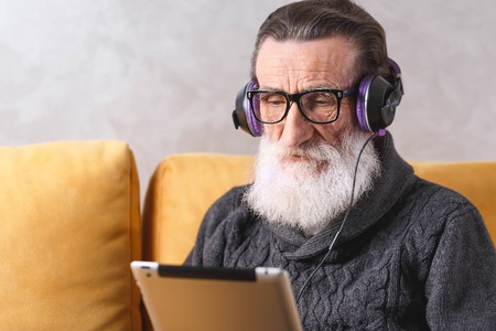 Senior contemporary bearded man in glasses wearing grey pullover sitting in headphones on a yellow sofa in his light living room and watching intresting movie on the tablet computer.