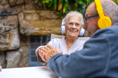 Happy elder people using headphones and smiling sitting in a garden in a geriatric