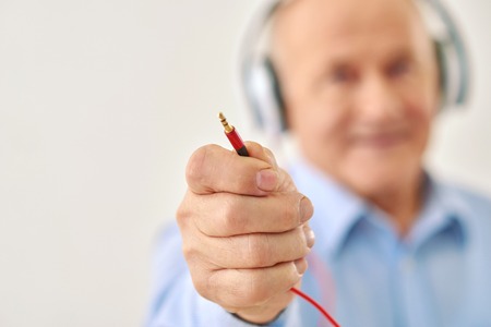Let is connect. Elderly man holding headphone cord, isolated on white background