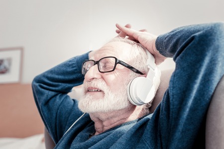 Pleasant pastime. Delighted nice elderly man sitting in the armchair and listening to music while enjoying his rest