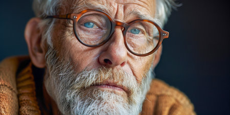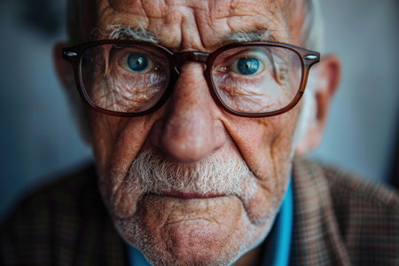 Capture the essence of wisdom with this close up portrait of an elderly man with clear blue eyes, wearing glasses, exuding a lifetime of stories