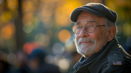 An older gentleman 75 years old gazes warmly at the camera, showcasing the lines of a life well-lived. He is dressed in a cap and coat, set against a blurred background during the day. Generative AI.