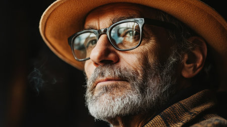 A close-up portrait of a thoughtful elderly man with glasses and a stylish hat, showcasing his wise expression and calm demeanor in soft natural light.