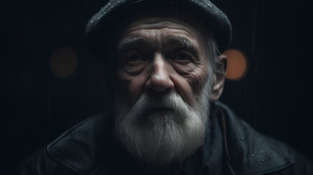 An elderly man stands on a busy street wearing a knit hat and a warm coat. Raindrops fall as colorful lights from cars blur in the background creating a moody atmosphere.