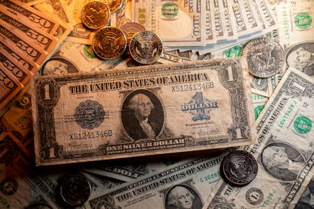 US dollar from 1923 next to half dollar coins. Dollar background. US currency evolving over time, large one dollar banknote on top of new dollar bills