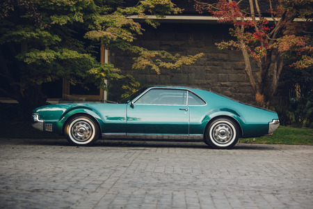 retro car concept. view of the front of the car with chrome details against a green vintage car