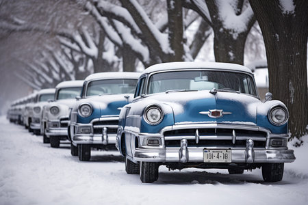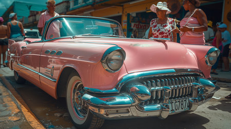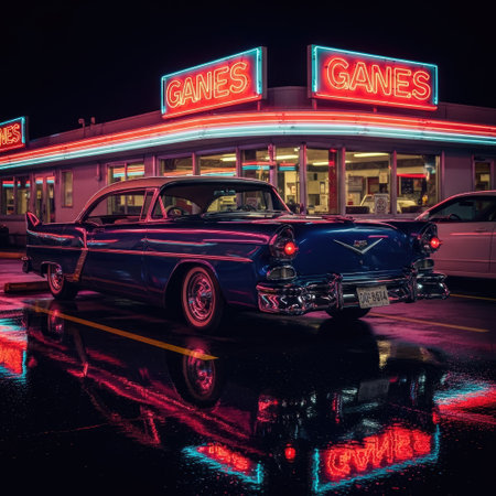 A vintage automobile is parked in front of a diner at night. The scene features illuminated neon signs, reflecting on the wet pavement. The image showcases a classic car, with vibrant colors, and a composition creating a retro atmosphere. Suitable for use in various commercial and editorial contexts.