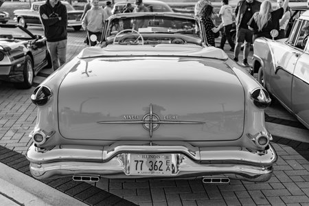Park Ridge, Illinois, USA - August 22, 2024: Oldsmobile 98 convertible retro car. Classic car of Oldsmobile 98. Oldsmobile 98 outdoor. Retro blue car parked at auto show, back view.