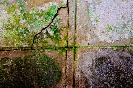 Old and worn red brick wall face with white and black cement coating peeling away.
