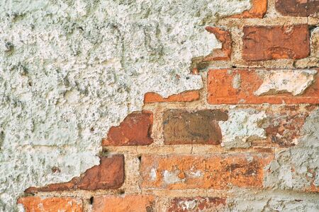 Old grungy red brick wall with peeled white beige stucco background. Vintage retro plaster wall with dirty cracked scratched texture background