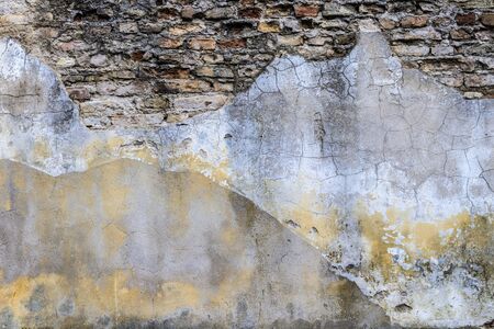 Background of old vintage dirty brick wall with peeling plaster, texture. Brick wall