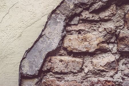 the old brick wall of the house from which part of the plaster has fallen off and destroyed, close-up of an old building during the period of its destruction