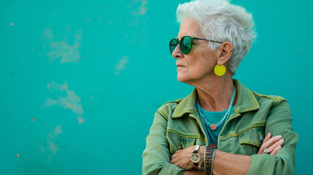 an older woman wearing sunglasses and a green shirt against a turquoise wall