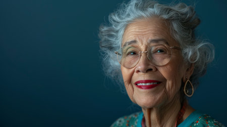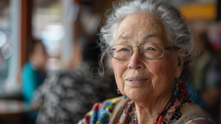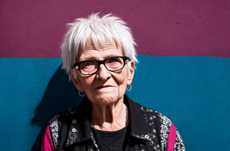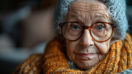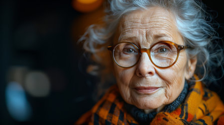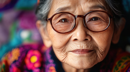 Intimate close-up of an elderly woman wearing glasses, her gentle expression reflecting wisdom and experience, with vibrant background.