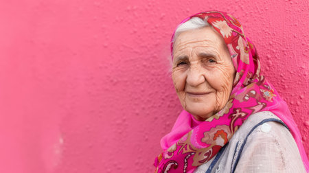 Elderly woman wearing headscarf, smiling against pink wall.
