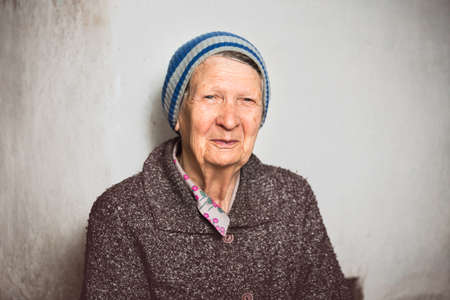 Portrait of an elderly woman in a warm coat and a cap.