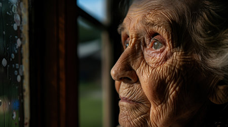 Close up portrait of elderly woman gazing thoughtfully out of window, with intricate wrinkles and expressive eyes reflecting sense of wisdom and nostalgia. soft light enhances details of her face