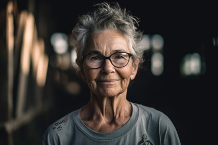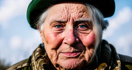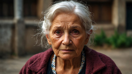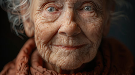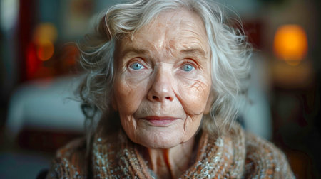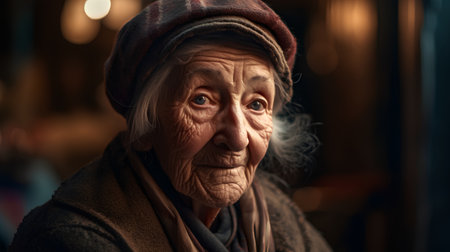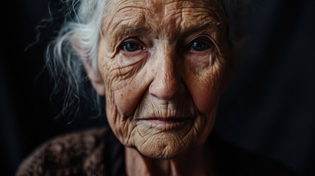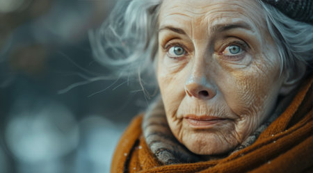 A serene elderly woman, eyes gazing contemplatively, embodies rustic charm and quiet homeliness Hints of handcrafted warmth perhaps a future knitted sweater suggest a life rich with resilience and wisdom Her portrait captures timeless strength, gentle craftsmanship, and the enduring texture of generations AI Generative