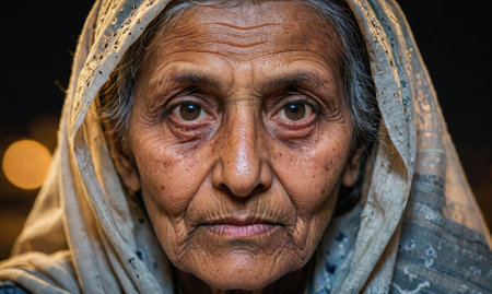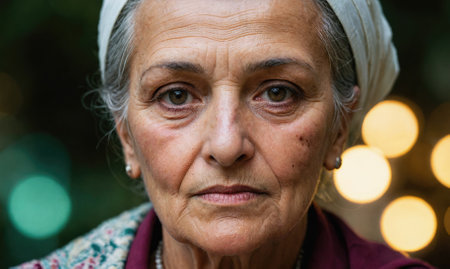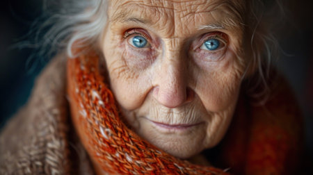 a close up of an elderly woman s face with a scarf around her neck