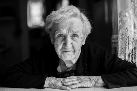 Portrait of old woman. Black and white photo.