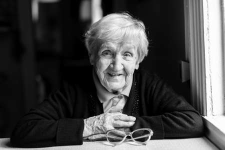An elderly woman, a grandmother, a black-and-white photography.