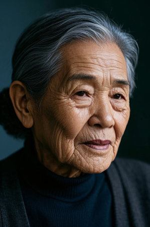 Close-up portrait of an elderly senior Asian thinking woman