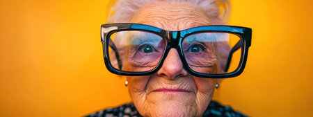 An Elderly woman wearing oversized novelty glasses, sparking laughter with playful expression against vibrant yellow background
