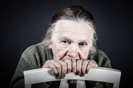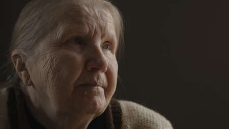 Portrait of an elderly woman on a dark background. The concept of loneliness and sadness.