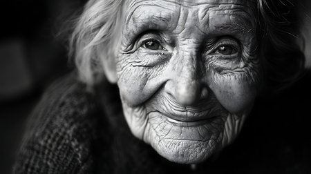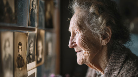 A deeply poignant close-up of a smiling elderly woman's profile with wrinkled skin, warmly gazing at a display of cherished, vintage black-and-white family photographs, evoking themes of memory, nostalgia, and long life