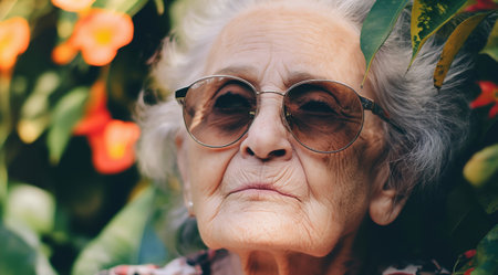 Elderly Woman with Sunglasses Enjoying Nature in Garden with Colorful Flowers.