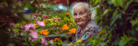 Elderly Woman Reflecting Among Vibrant Garden Flowers in Peaceful Outdoor Setting.