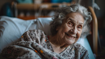 A radiant elderly woman shares a heartfelt smile showcasing the beauty of aging and the warmth of home.