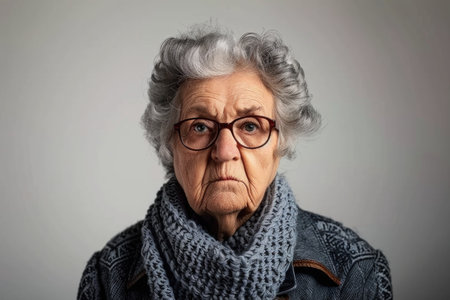 An elderly woman wearing glasses and a knitted scarf stars directly at the camera with a serious expression.