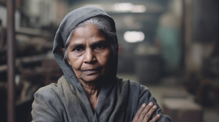 A smiling senior Indian female factory worker standing in metal sheet factory. Generative AI AIG19.