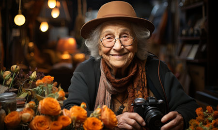 An elderly woman wearing a hat and glasses capturing memories with a camera.